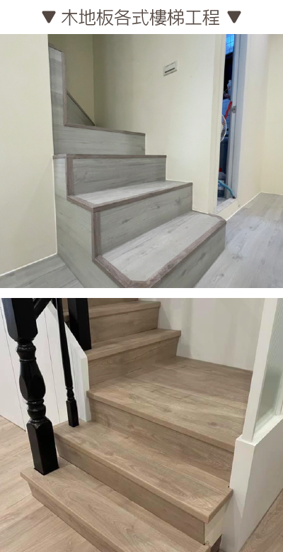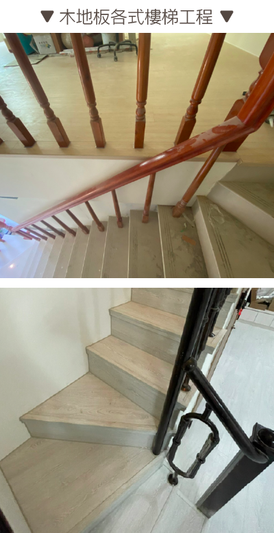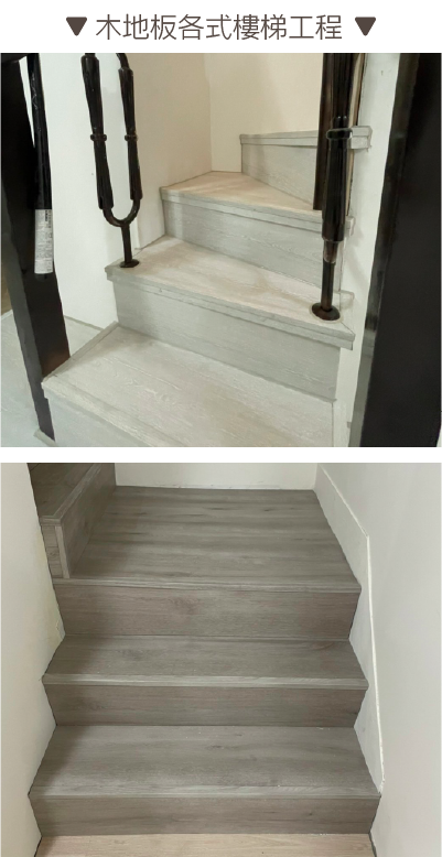 我們提供各式樓梯工程、海島木地板、架高地板、超耐磨密集板等地材項目客製化施工安裝